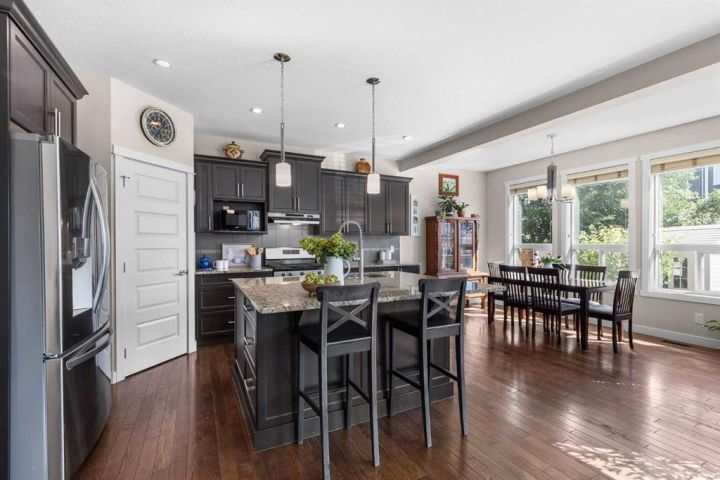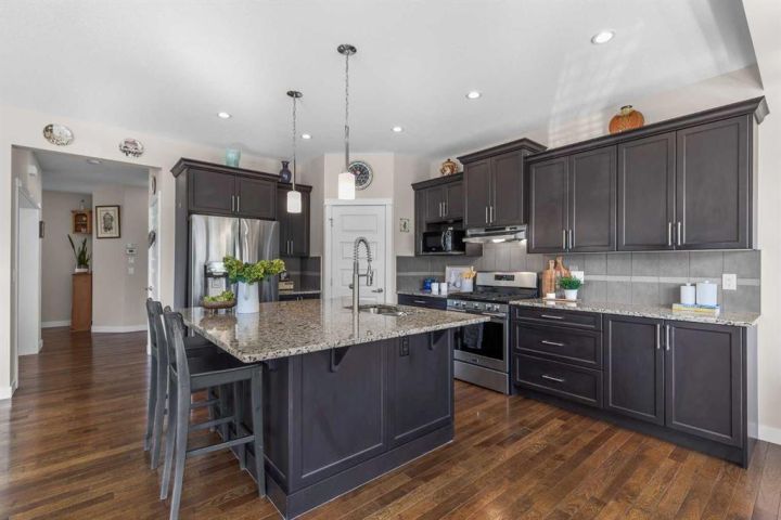 The heart of the home is the open-concept main floor, featuring rich hardwood flooring, a sunny living room with cozy gas fireplace, and a bright breakfast nook framed by windows. The chef-inspired kitchen offers granite countertops, a large central island with storage, gas range, upgraded fridge with water and ice, ample cabinetry, and a corner pantry—perfect for busy family life and entertaining alike.