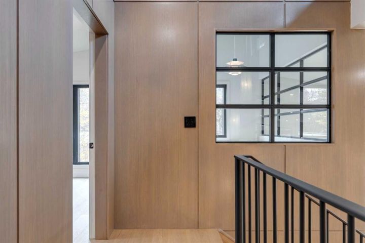 Step inside to a foyer featuring white oak wall paneling and Limestone Bluestone pavers, setting the tone for the elegance carried throughout the home. The main level centers around a stunning chef-inspired kitchen equipped with a 48” Fulgor range, hoodfan & dishwasher, 36" Thermador fridge, all top of the line appliances. The perimeter counters are Temptation Quartzite w/leather finish, the island countertop - absolute Black granite w/brushed finish create a dramatic focal point, while custom white oak and painted cabinetry offer generous storage. The adjacent living and dining areas provide a seamless open-concept layout, highlighted by a gas fireplace with a Concrete Quartz surround, custom steel detailing, white oak millwork and expansive row of patio doors & windows that bathe the space in natural light.