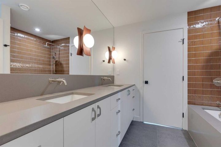 The upper level is anchored by an exceptional primary suite designed as a true retreat. The ensuite features striking “Fusion Wow” Quartzite, micro cement walls and ceilings in the shower, Riobel fixtures, a rain shower, freestanding tub and heated porcelain floors. A home office is adjacent to the primary bedroom. Two additional spacious bedrooms share a stylish Jack and Jill bathroom with Concrete Quartz finishes and glazed porcelain tile. A beautifully designed laundry room with LG large-capacity appliances, stone counters and built-in drainage adds convenience and functionality.