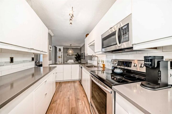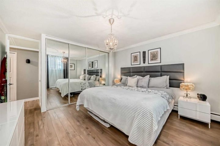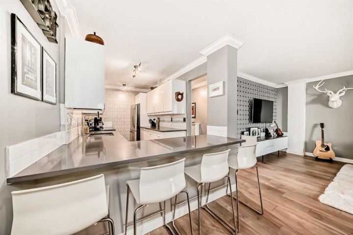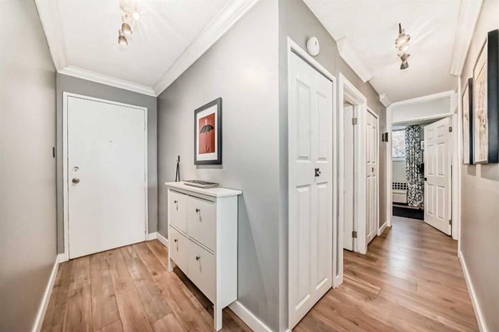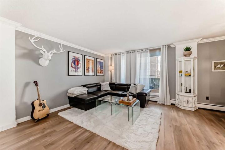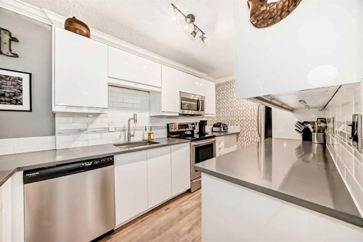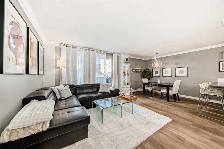 Get ready to fall in love! FULLY RENOVATED HOME! Sunny South Facing Home | End Unit | Quiet Concrete Building with NO Post Tension Cables! Proudly welcoming you home to Manor House – this well-cared for, well managed complex features this STUNNING 2-bedroom home that has been transformed and modernized, in the desirable Beltline neighbourhood – just steps away from all the action! Your new home is ideally tucked away in a quiet corner. Inside you will instantly appreciate the new beautifully elegant luxury vinyl plank flooring throughout the home which matches the modern décor throughout. The home features exceptional updates and upgrades throughout, which start out in the striking kitchen. The kitchen has been completely renovated, highlighted by all-new cabinetry and stunning Quartz gun metal grey countertops, with undermount sink. Counter level seating awaits, perfect for visiting with friends and family as you entertain from your exquisite gourmet kitchen. Updated SS appliances await. There is ample space for a deep freeze IN your kitchen, without losing any counter or cupboard space! Just off the kitchen is a large dining room, which can easily host a sizable dining table. This home features beautiful crown moulding throughout; as well as beautifully updated lighting throughout. The large stunning living room is an exceptional space, large enough to accommodate all of your furniture, providing plenty of space to relax or provide the ideal space to entertain friends and family! The tour continues with 2 large closets, and an updated & stunning 4-pc bathroom. The Primary bedroom is one of the largest you will find – hosting a King size bed, dresser and nightstands with ease, while still allowing for ample space leftover. The Primary closet features custom built-ins, easily organizing your wardrobe. The secondary bedroom is of excellent size and is the ideal place to host your home office, guest bedroom or use as a Yoga space! Updated vinyl windows allow your home to be energy efficient year-round! The large (11.5x 5 ft) balcony is ready for your enjoyment – offering endless sunshine with a sunny south facing view, perfect to enjoy in the warmer months! There is FREE laundry located on every floor of this superb building. Your new home comes with one assigned secure parking stall + additional storage locker for your items you don’t use every day. There is so much to love about this unique home including its location! A true 'walker’s paradise' with a walk score of 99/100 – it doesn't get any better than this! You can walk or bike easily to work, and take in and enjoy the multitude of local shops, restaurants, pubs, grocery stores, and so much more! Book your Private viewing today – this one won’t last long!