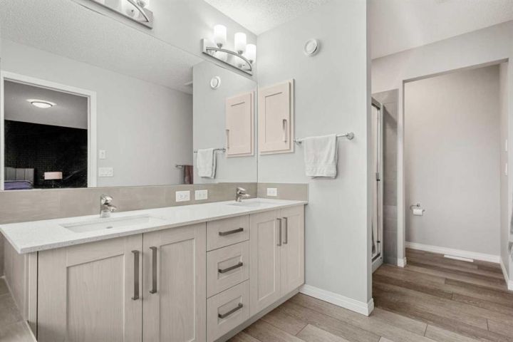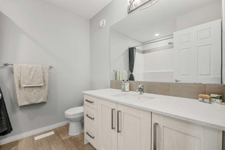 Retreat to the spacious 16’ x 13’ primary suite, complete with a luxurious ensuite featuring double underhung sinks, a soaker tub and quartz countertops. The main upstairs bathroom also includes quartz counters, an extra set of drawers, and premium finishes throughout.