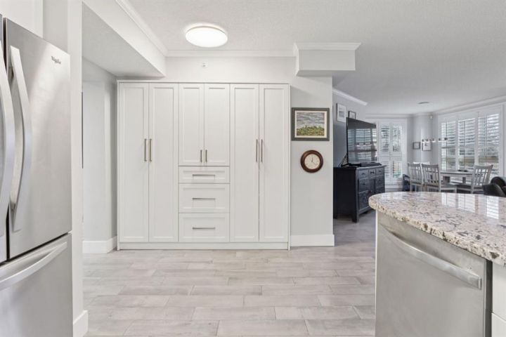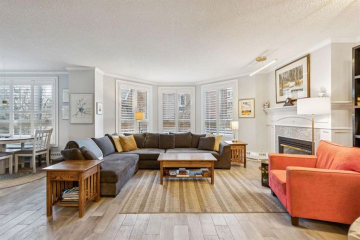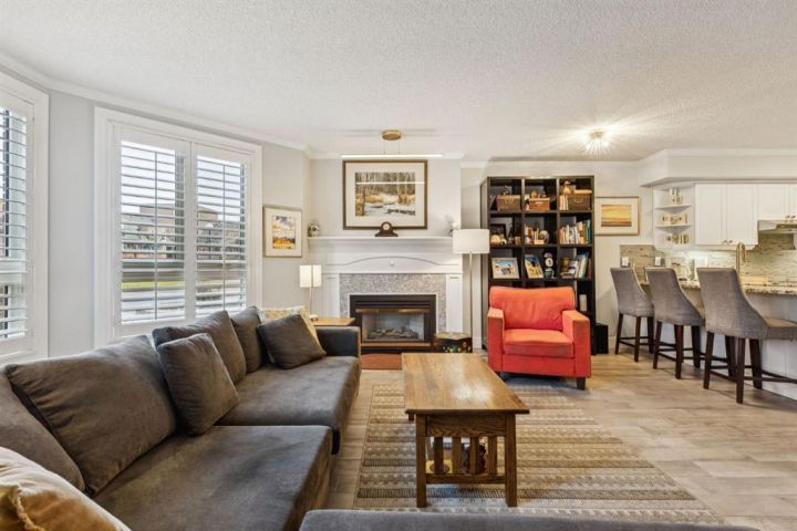 Thoughtful updates and timeless design create a warm, inviting atmosphere throughout. The open-concept layout features large windows, while the generous living area is anchored by a cozy gas fireplace—an ideal setting for relaxing or entertaining. The well-appointed kitchen offers abundant cabinetry, granite counters, quality appliances, and a layout perfect for casual dining or hosting guests. The two bedrooms are separated for privacy, with the primary suite offering a walk-through closet and its own ensuite. A second full bathroom, in-suite laundry, central A/C, and plenty of storage add to everyday convenience. Enjoy morning coffee or evening unwinding on a spacious wrap-around balcony with serene views of the complex’s quiet, treed green space. This unit also includes titled underground parking and assigned storage.