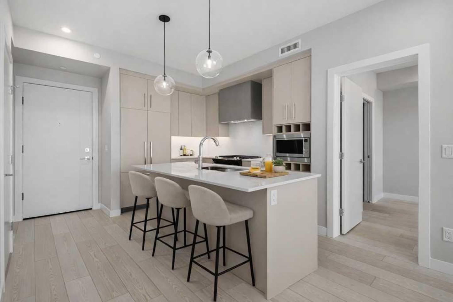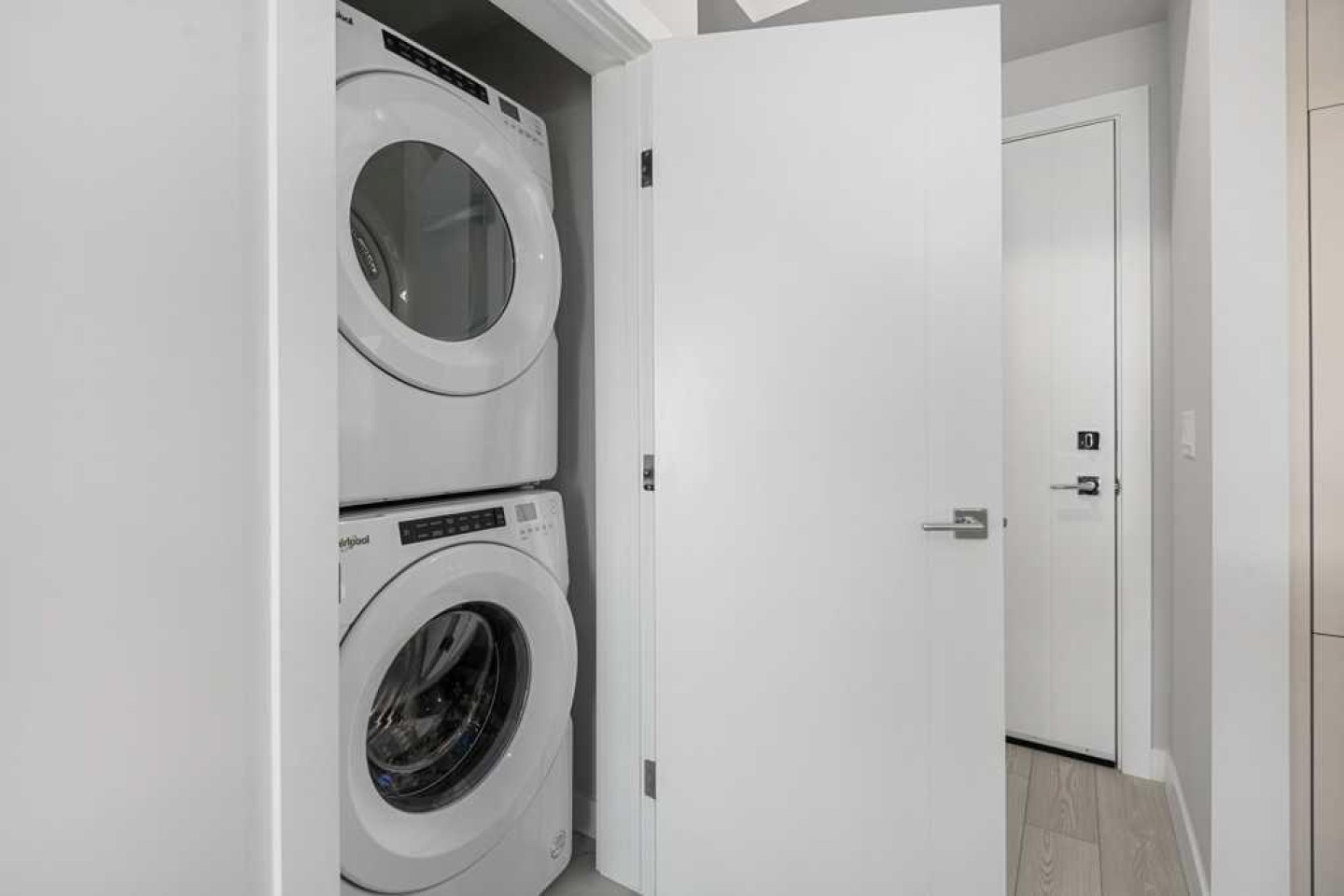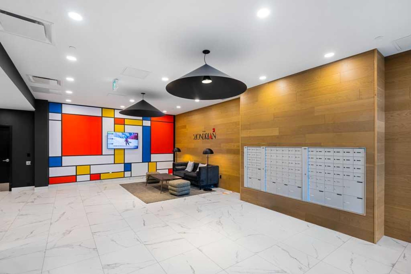 Contemporary living awaits at The Mondrian. This stylish 2 bedroom, 2 bathroom residence is beautifully curated by Truman’s award-winning design team and delivers a true “wow” factor with 9-foot ceilings, air conditioning, roller-shade window coverings, premium LVP flooring with acoustic underlay, and custom energy-efficient LED lighting throughout. The contemporary kitchen impresses with high-end, energy-saving stainless steel appliances, floor-to-ceiling ergonomic cabinetry, polished quartz countertops, and deep drawers designed for everyday function and clean modern style. Retreat to the expansive primary suite featuring a spacious walk-through closet leading to a luxe spa-inspired ensuite with a modern square-edge countertop, designer vanity, and environmentally conscious fixtures. The open-concept living area flows seamlessly to your private balcony, perfect for morning coffee or evening downtime. Enjoy the convenience of in-suite laundry, plus titled underground parking and a secure storage locker. Top it off with access to the breathtaking rooftop lounge with incredible views, all set in a vibrant community surrounded by cafés, restaurants, and boutique shops—and just a short drive to downtown or the mountains. **Some images have been virtually/digitally staged to illustrate possible furnishings and layout.