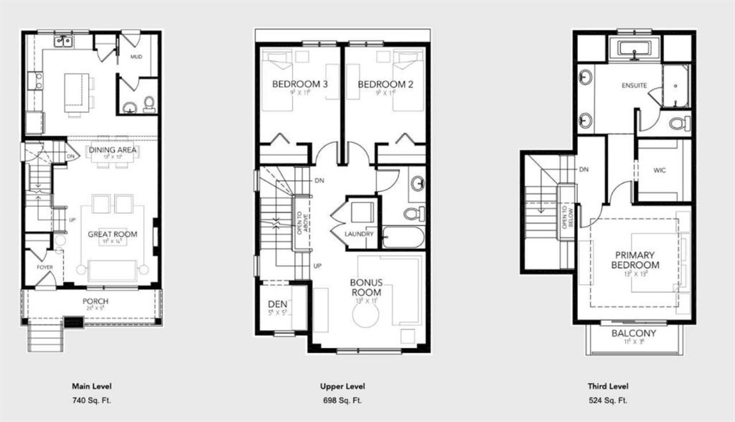 Scheduled tentatively for early 2026 possession, 28 Bluerock Terrace SW features the Skyline model by Calbridge Homes in the desirable Alpine Park community. This thoughtfully designed 1,962 sq ft home offers 3 bedrooms and 2.5 bathrooms across a unique three-level layout. The main floor welcomes you with a spacious front porch and an open living area anchored by an L-shaped kitchen with a window above the sink and a large central island—ideal for everyday living and entertaining. The upper level includes two bedrooms, a versatile bonus room, and a den, providing flexible space for work or relaxation. The entire third level is dedicated to the private primary retreat, complete with a balcony offering a quiet outdoor escape. A double attached garage adds everyday convenience. Located close to parks, pathways, and future amenities, this home blends modern design, privacy, and functional living in one of southwest Calgary’s most exciting communities.