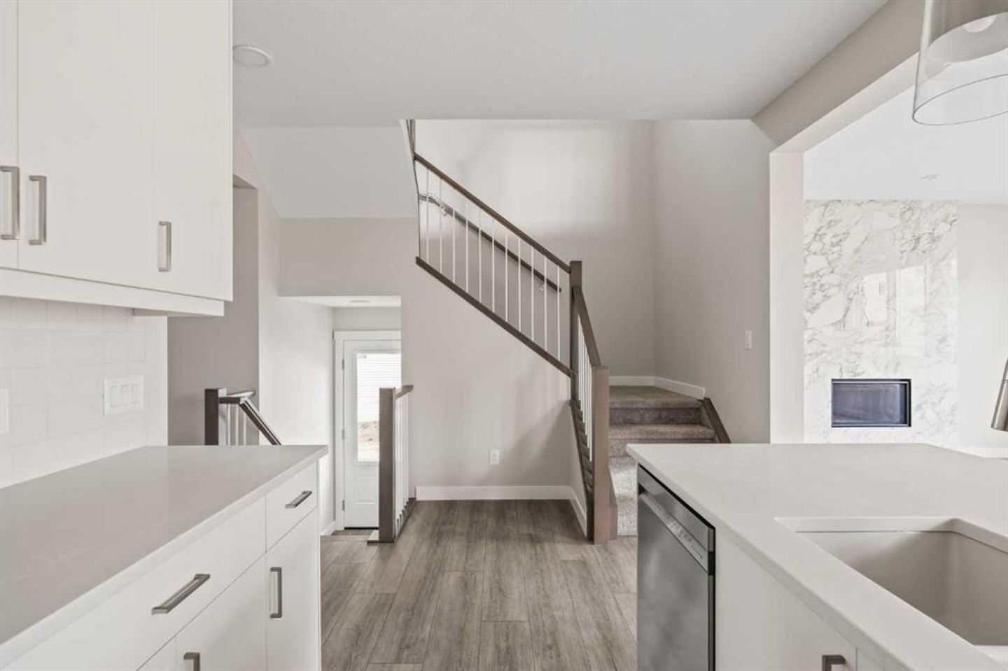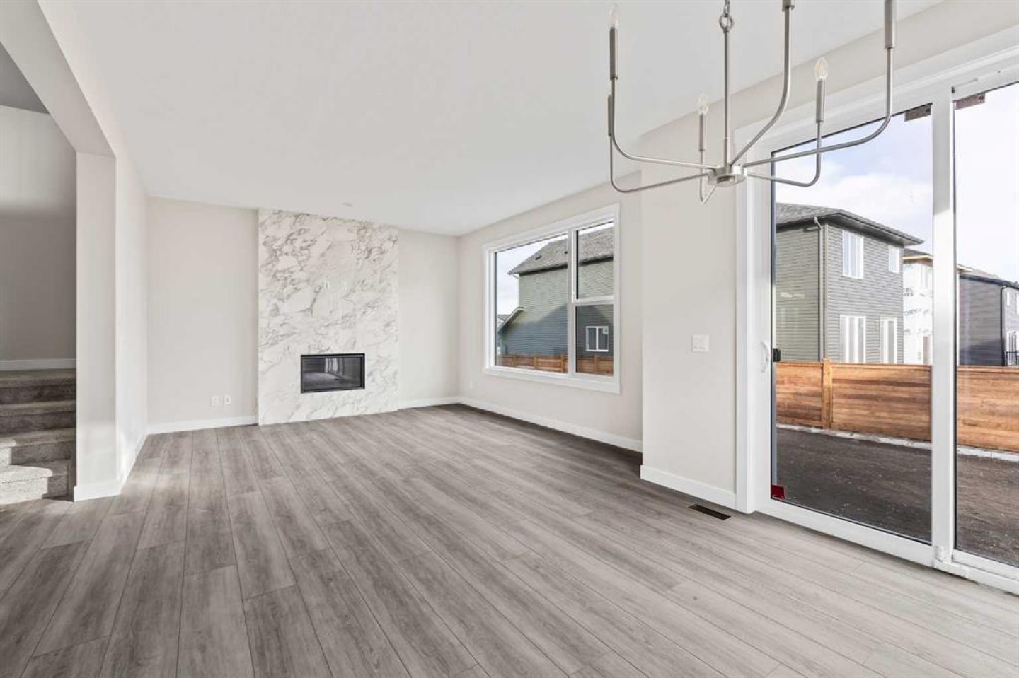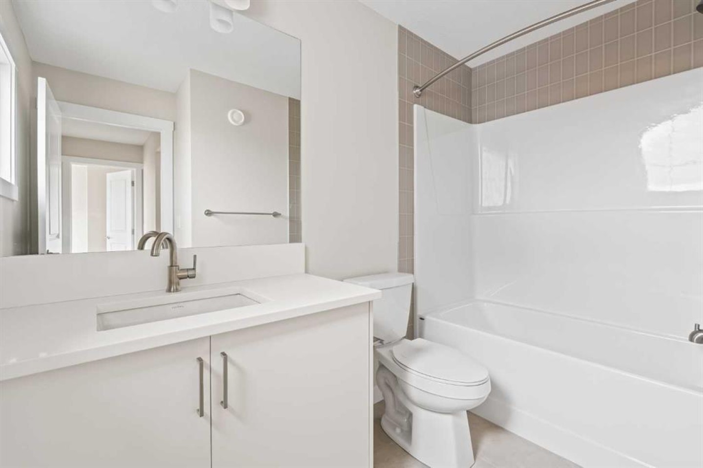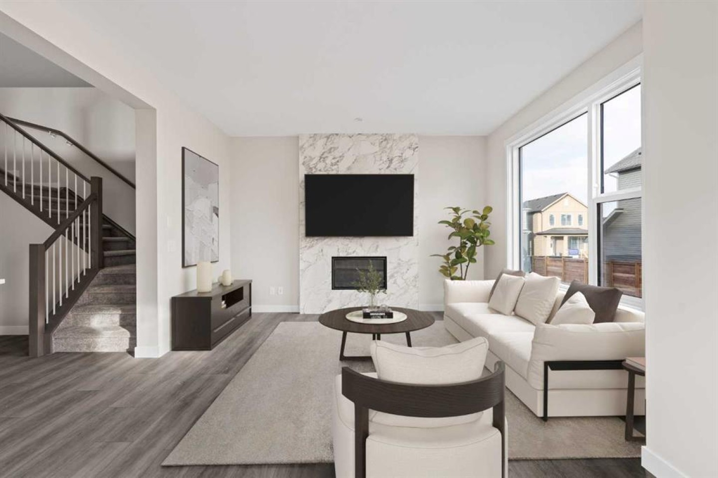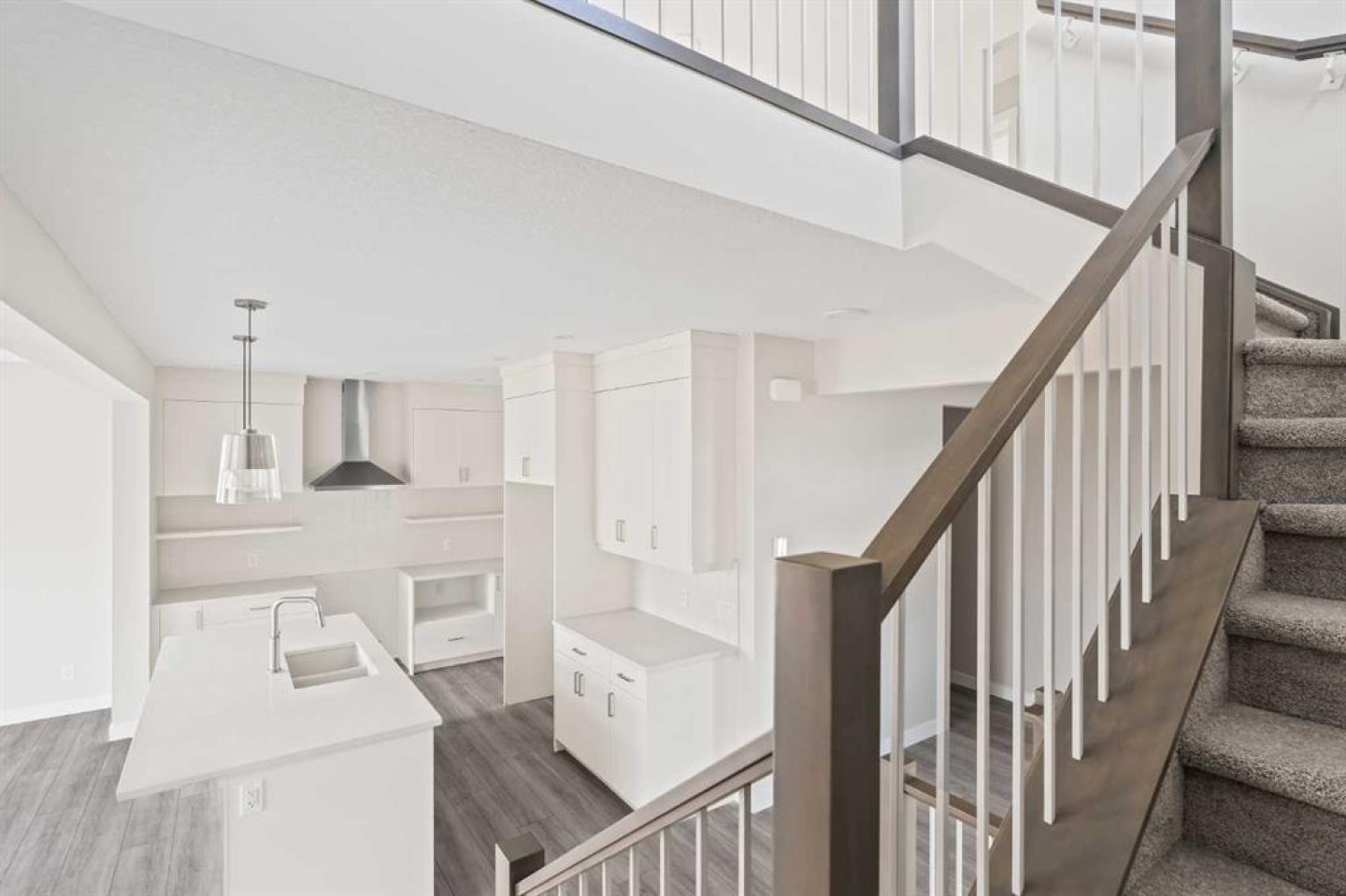 This stunning brand-new home by Brookfield Residential is move-in ready and perfectly situated in the vibrant community of Chinook Gate in Airdrie. Thoughtfully designed, the Rundle 26 offers the ideal blend of everyday comfort and elevated living with expansive living spaces, 3 bedrooms, 2.5 bathrooms, and an undeveloped basement featuring bathroom rough-ins and a separate side entrance for future development potential. The heart of the home is the beautifully appointed chef-inspired kitchen, showcasing timeless white cabinetry, light quartz countertops, floating shelves and a suite of stainless steel appliances including a built-in chimney hood fan and microwave. A large island anchors the space while the walkthrough pantry connects seamlessly to the mudroom and double attached garage - a layout designed for real life convenience. Open to both the dining area and great room, the main floor is perfectly suited for entertaining and family living. A central gas fireplace in the main level great room is the perfect addition for cozy winter nights. A wall of windows across the back of the home floods the home with natural light, while patio doors lead directly to the backyard - ideal for summer evenings. The backyard already has a gas line rough-in for a BBQ, adding to everyday convenience. Natural wood and spindle railings guide you to a central bonus room that thoughtfully separates the primary retreat from the secondary bedrooms. The spacious primary suite features a spa-inspired 5-piece ensuite with dual vanities, a soaker tub, a fully tiled walk-in shower, and a generous walk-in closet. Two additional bedrooms, a full bathroom, convenient upper-floor laundry, and ample storage complete the level. The nearly 800 sq. ft. basement offers endless possibilities - whether you envision a recreation space, additional bedrooms, a home gym, or something else, the options are endless for a growing family. Set on a bright lot, this home offers the perfect combination of indoor comfort and outdoor enjoyment. Backed by both the Builder Warranty and Alberta New Home Warranty, you can purchase with complete confidence. Move-in ready and beautifully finished, the Rundle 26 in Chinook Gate presents an exceptional opportunity for families seeking space, functionality, and the advantages of brand-new construction in one of Airdrie’s most exciting communities.
