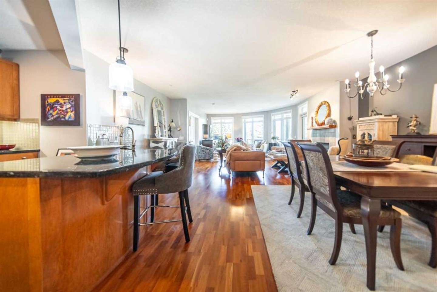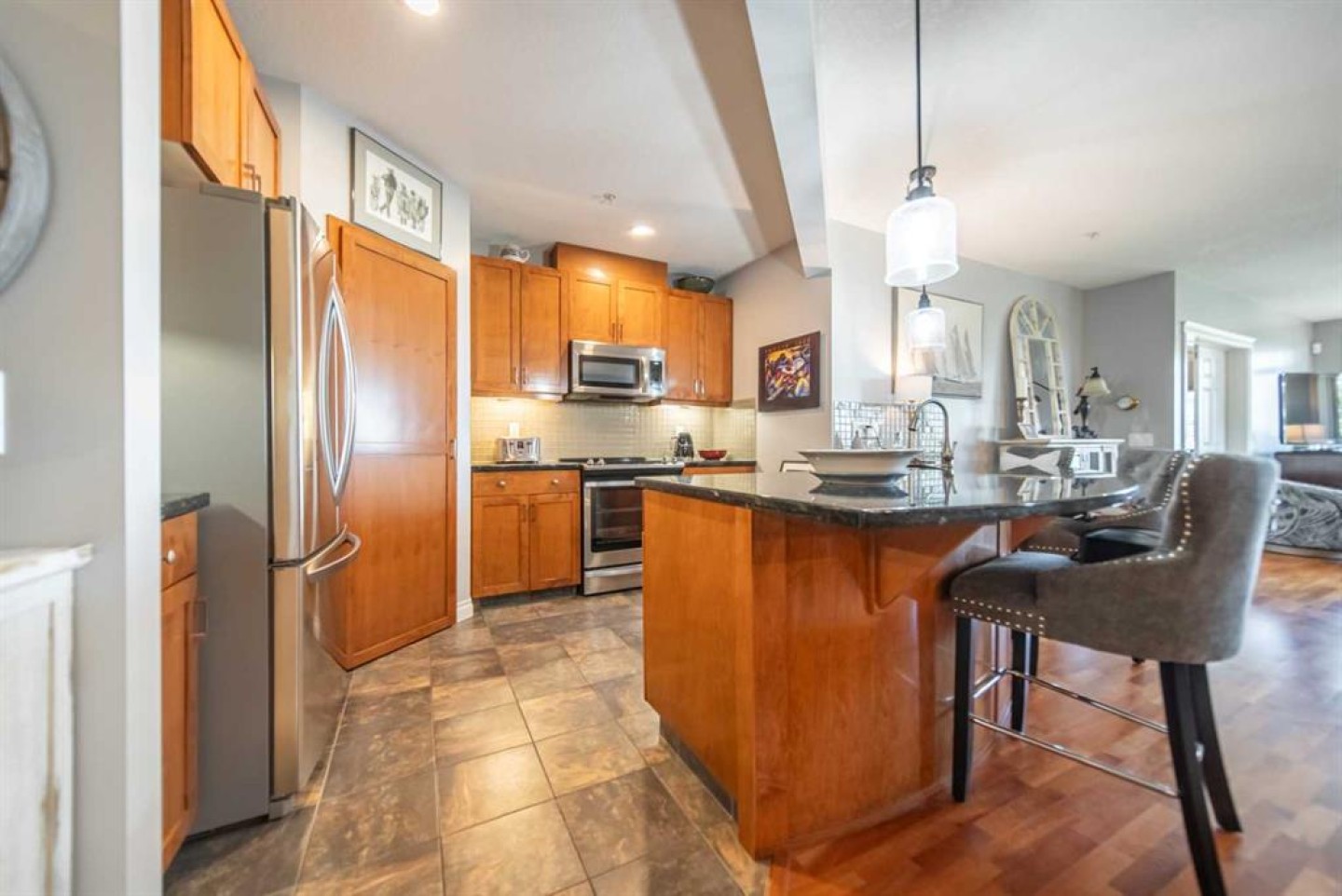 ** OPEN HOUSE SUNDAY MARCH 1, 2:30 - 4pm ** Step into elevated condo living with this stunning 2-bedroom, 2-bath residence, spanning over 1,400 sq. ft. of thoughtfully designed space. From the moment you walk in, you’re greeted by an open concept layout drenched in natural light, framed by floor-to-ceiling windows and a spectacular wrap around deck that perfectly blends indoor comfort with outdoor charm. The chef inspired kitchen is the heart of the home, featuring sleek granite countertops, high-end stainless steel appliances, rich cabinetry, and a large island that flows seamlessly into an inviting dining area and spacious living room, perfect for entertaining or unwinding in style. Your primary suite sets the stage for pure relaxation, complete with a custom walk-in closet, access to the patio and a spa like ensuite featuring dual vanities, a glass enclosed shower, and a deep soaking tub made for long, restorative escapes. The second bedroom and full bath offer flexibility for guests or a home office, whatever your lifestyle demands. This remarkable home also includes TWO titled parking stalls a private underground storage cage as well as storage room on the patio. Residents enjoy access to premium amenities such as a fully equipped fitness centre, hobby and craft rooms, a convenient car wash bay, and secure bike storage. Situated beside serene green spaces and scenic walking paths, you’re just moments from Shaganappi Golf Course, downtown Calgary, trendy local cafés, Westbrook Mall shopping, and nearby transit options. Experience modern luxury and effortless convenience
