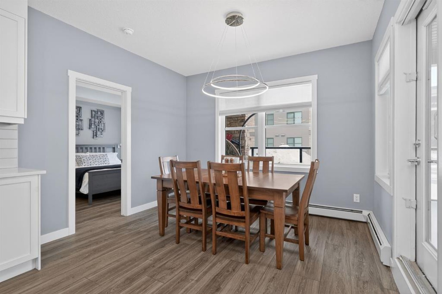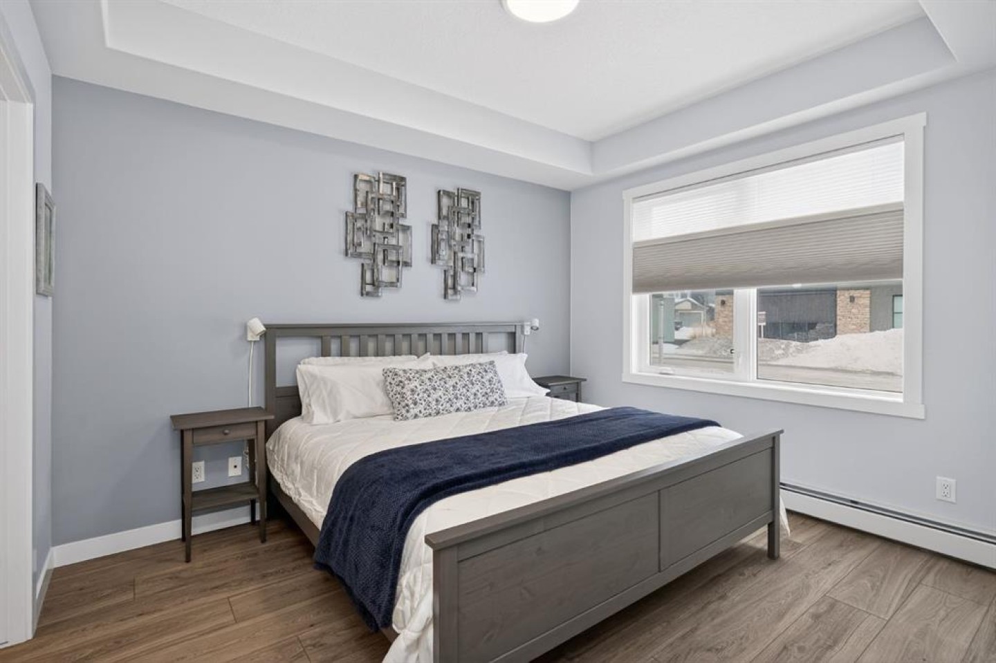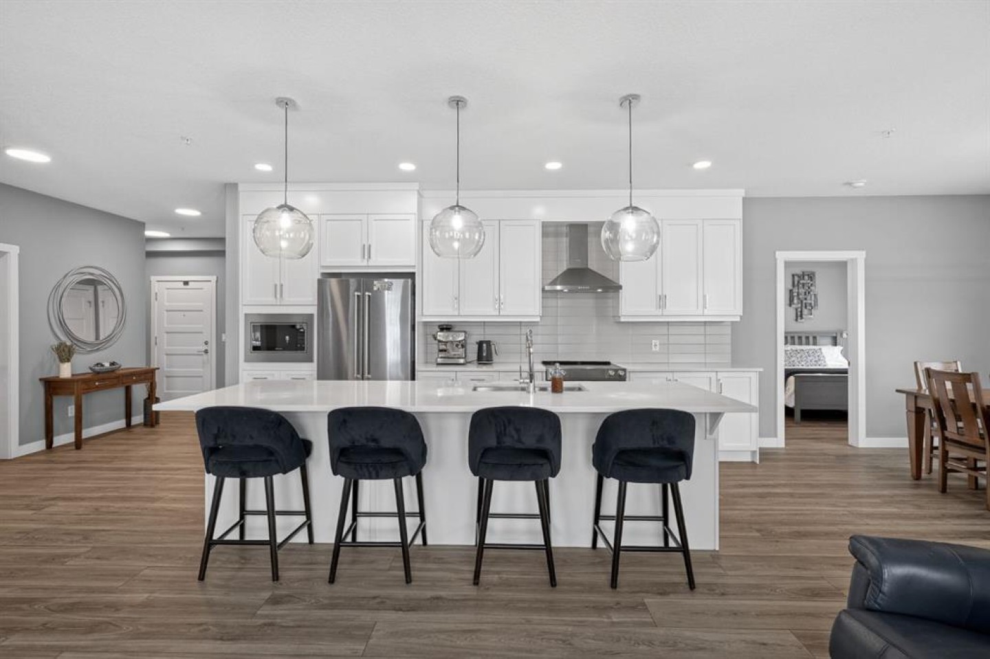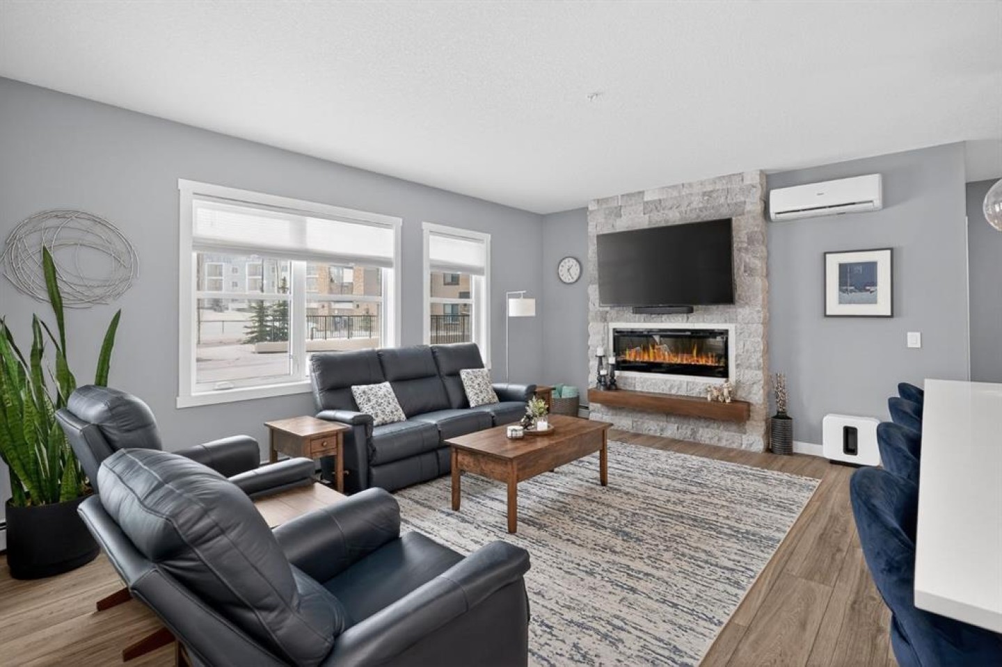 Welcome to Bow360 in the heart of Wolf Willow, where bungalow-style living meets modern lock-and-leave convenience. This beautifully upgraded corner unit offers one of the largest floorplans in the building with 1,174 sq ft of bright, thoughtfully designed living space, perfect for those seeking turnkey, low-maintenance living without sacrificing comfort or style. A spacious foyer welcomes you into the open-concept layout, highlighted by top-of-the-line luxury vinyl plank flooring, remote blinds, and extensive upgrades throughout. The inviting living area is anchored by a stunning stone feature fireplace, creating a warm and elegant focal point while oversized windows fill the home with natural light. The chef-inspired kitchen showcases upgraded appliances, quartz countertops, designer tile, and an expansive island ideal for entertaining or everyday living. The adjacent dining and living spaces flow seamlessly to the southwest-facing wraparound patio, offering the perfect setting to relax, host guests, and enjoy sunny afternoons. The primary retreat is thoughtfully designed with a walk-in closet and a spa-inspired ensuite featuring dual sinks, an upgraded walk-in shower, and elevated tile finishes. A second bedroom and versatile flex room/den provide additional space for guests, hobbies, or a dedicated home office. Additional highlights include an upgraded air conditioning wall unit, titled underground parking, and premium finishings throughout, delivering true turnkey living in one of Calgary’s most desirable new communities. Ideally located near the Bow River, scenic pathways, Blue Devil Golf Course, and everyday amenities just minutes away, Bow360 offers a vibrant yet peaceful lifestyle with maintenance-free living and exceptional access to nature and convenience.
