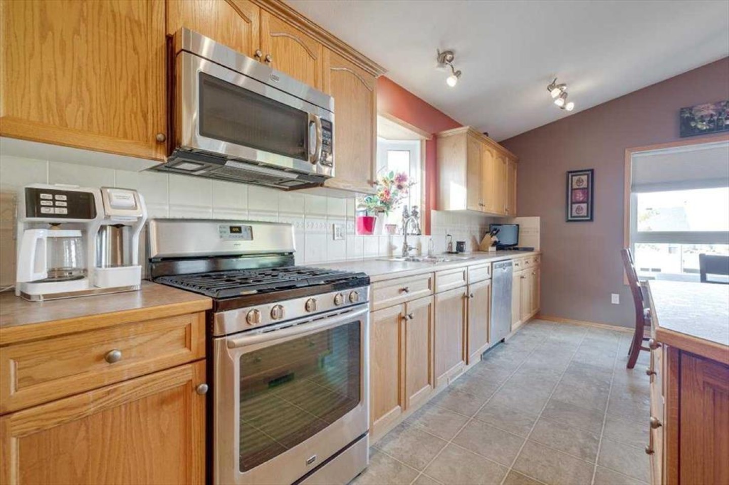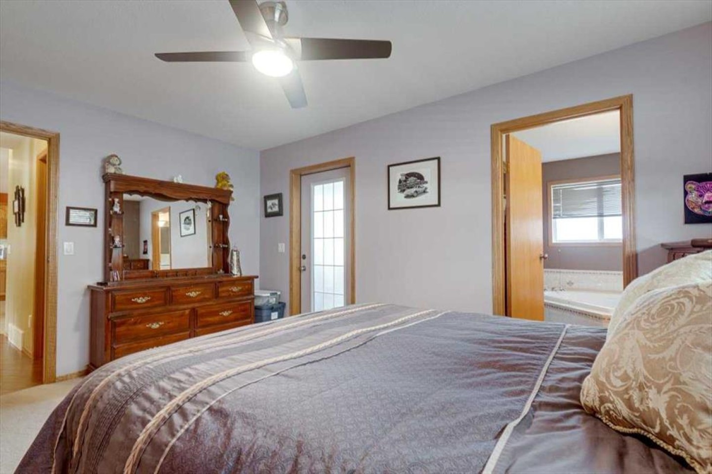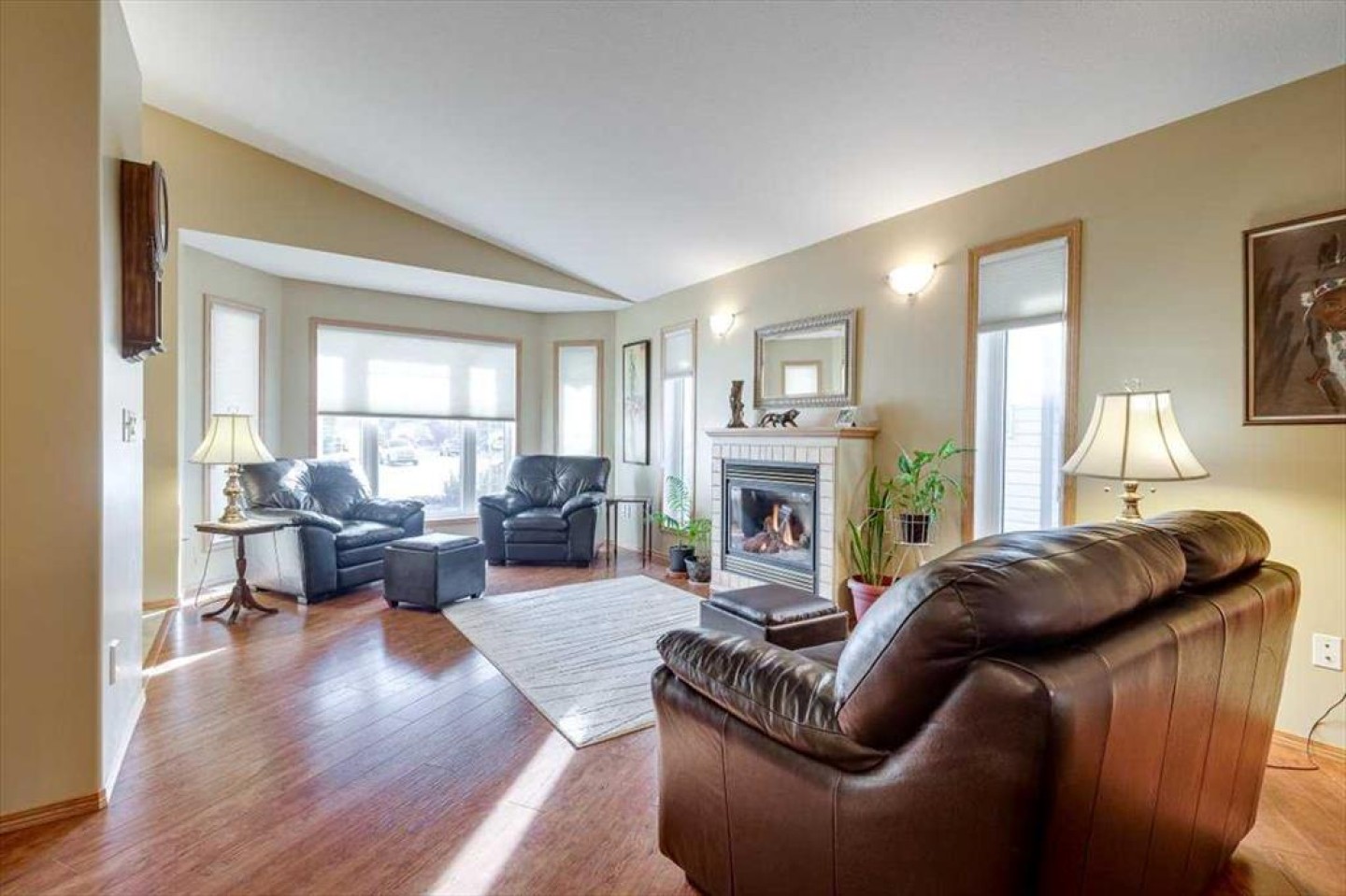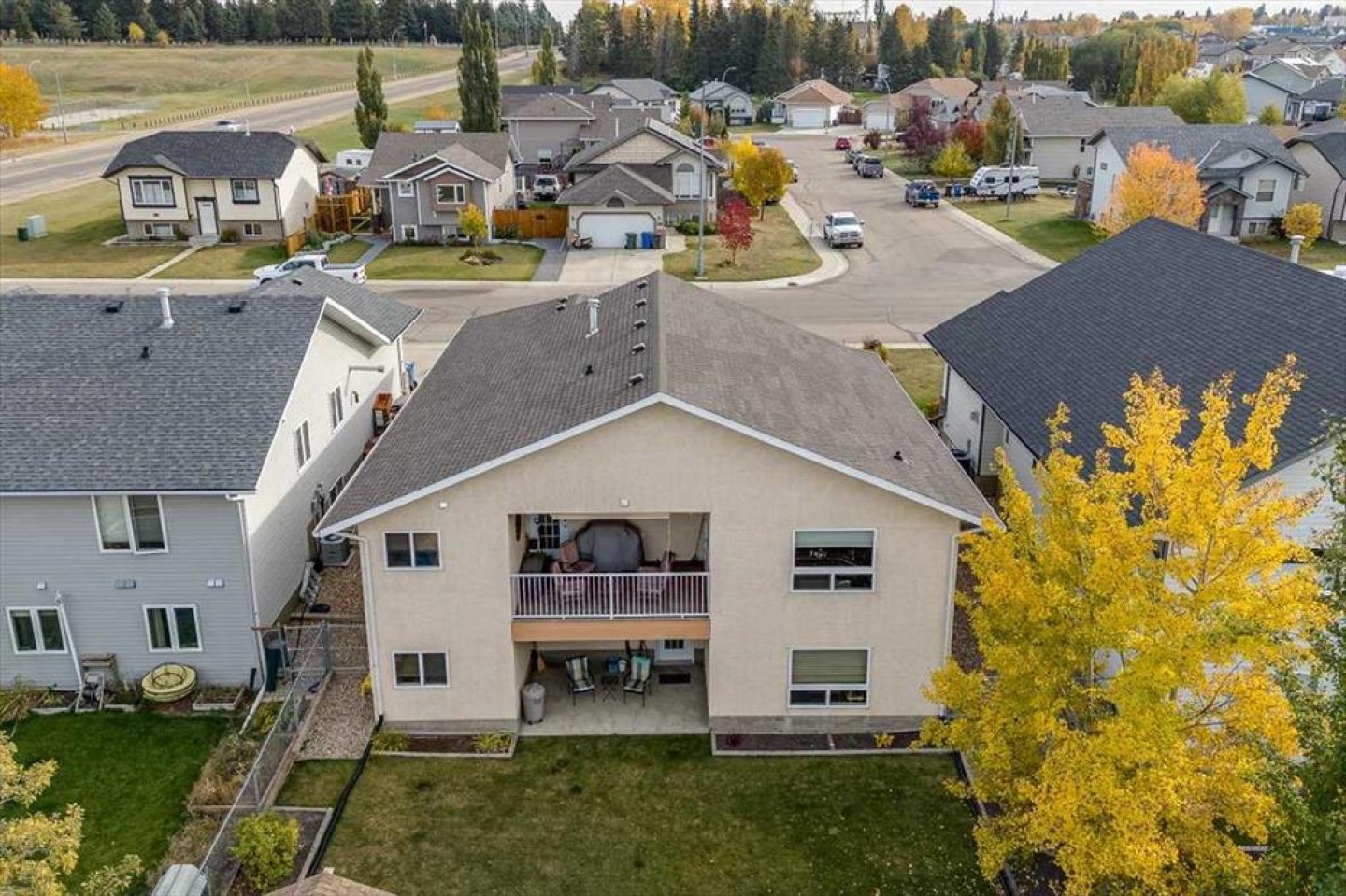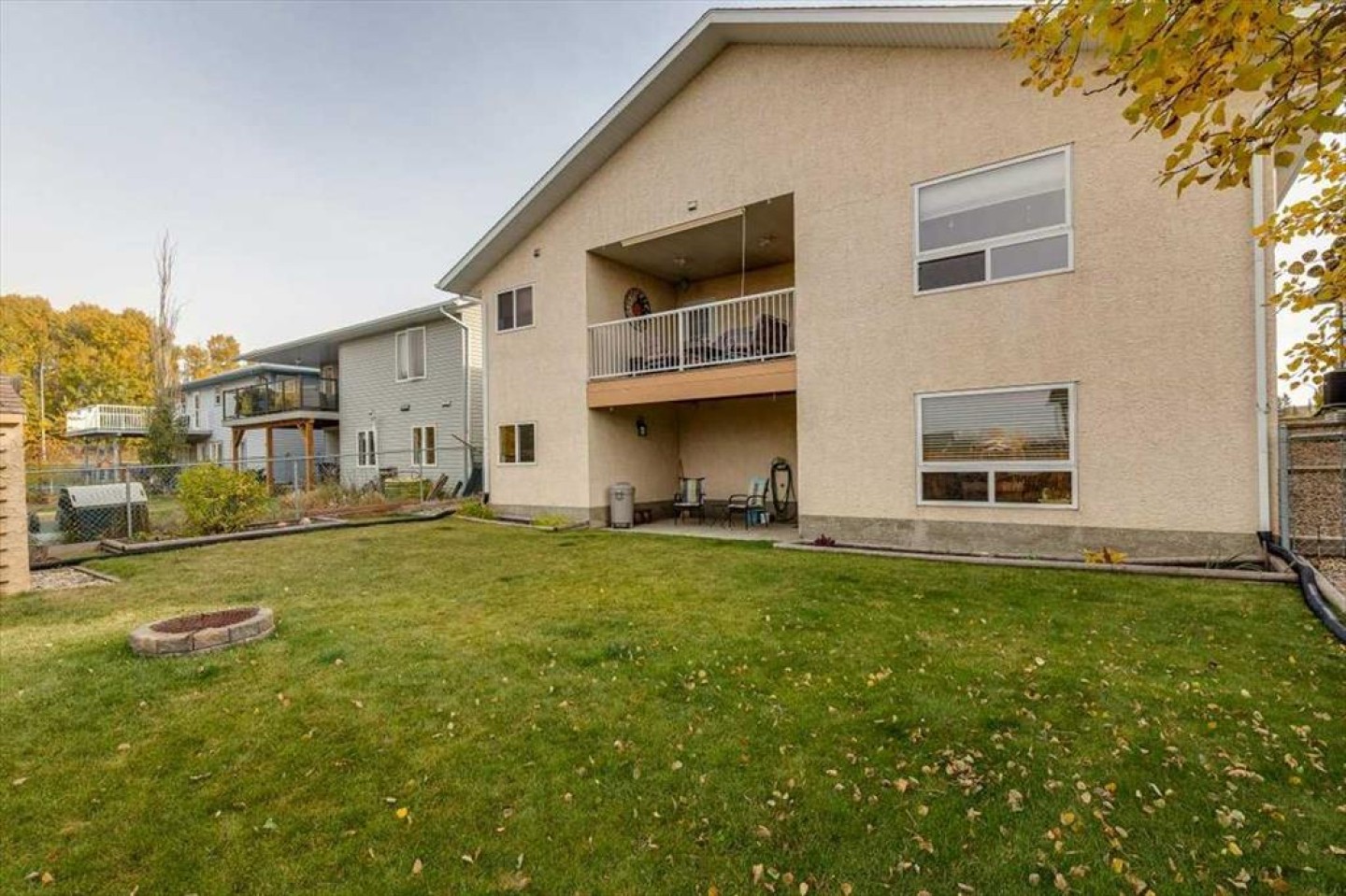 Well-maintained bungalow home offering over 2,800 sq ft of fully developed living space in a quiet, established Innisfail neighborhood! A spacious front entry welcomes you into the bright main floor where cathedral ceilings and an inviting gas fireplace create a warm, open atmosphere. The kitchen is designed for gathering, featuring a large island, gas stove, ample cabinetry, and a generous dining area with access to the covered deck overlooking the fenced yard and open greenspace beyond. Updated vinyl plank and textured laminate flooring add both style and durability. The primary suite includes dual closets and a private ensuite complete with a jetted soaker tub and separate shower. A second bedroom, full bathroom, and convenient main floor laundry complete the main level. The fully developed walkout basement offers a massive recreation room with plenty of space for a home theatre, gym area, pool table, or games space, along with two additional bedrooms, a full bathroom, and excellent storage! Step out onto the covered patio and enjoy the privacy of the backyard setting. Additional features include a double attached garage, 2018 shingles, 2021 on-demand hot water, a water softener, sump pump, gas line for the BBQ, and a shed. A rare combination of space, privacy, and layout-all in one well-maintained package!