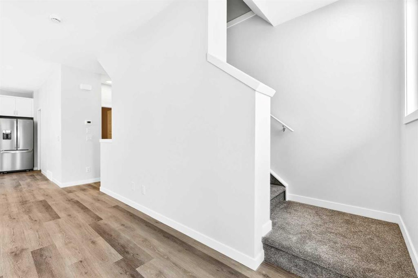 StreetSide proudly presents this exceptionally popular exterior-unit townhome, where expansive living areas meet modern comforts and sophisticated finishes. The thoughtfully designed floorplan features three spacious upper-level bedrooms and two and a half well appointed bathrooms, complemented by a versatile lower-level den perfect for a home office or quiet retreat. The heart of the home is an inviting open-concept main floor, anchored by a large gourmet kitchen featuring a functional breakfast bar for casual dining. This bright living space transitions seamlessly to a private balcony, offering a perfect setting for outdoor relaxation. The interior showcases high end craftsmanship, including modern white slab-style cabinetry with a full bank of drawers for maximum storage. The kitchen is further elevated by polished white quartz countertops and a full suite of premium stainless steel appliances. Durable luxury vinyl flooring runs throughout the primary living areas, while the stairs and upper level are finished with plush carpet over an 8lb underlay for superior comfort. Additional conveniences include an attached double car garage and a lifestyle defined by maintenance free living and professionally maintained landscaping. Located in the vibrant community of Rangeview, Calgary’s premier garden-to-table neighborhood, this home offers a unique balance of village-like serenity and urban convenience. The development centers around a lush courtyard garden, providing residents with unparalleled access to community gardens, educational programming through the Home Owner’s Association, and year-round local markets. Enjoy the ease of proximity to local amenities and major routes while living in a master-planned community that celebrates connectivity and style.