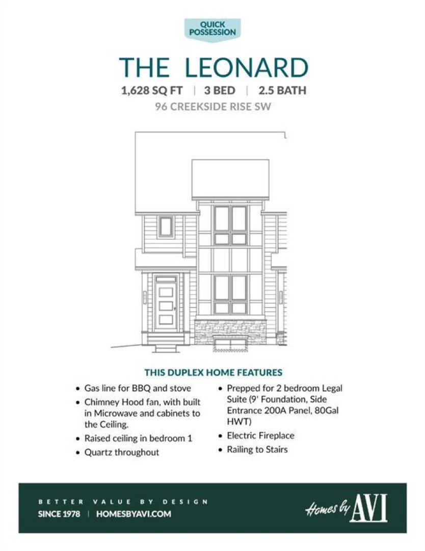 Sirocco at Pine Creek is ONE OF THOSE SOUTHWEST COMMUNITIES THAT FEELS LIKE YOU’RE SLIGHTLY REMOVED FROM THE NOISE — perched near Sirocco Golf Club, threaded with pathways, and still close enough to Shawnessy and major routes that daily life stays easy. It’s calm without being isolated. And that balance matters. Now let’s talk about THE HOUSE. This MOVE-IN READY Leonard offers 1,628 square feet, three bedrooms, 2.5 baths, and a layout that actually understands how people live. There’s a POCKET OFFICE ON THE MAIN FLOOR — not an afterthought, not a desk squeezed into a hallway — but a real, defined workspace that keeps your dining table from becoming mission control. The kitchen delivers the upgrades you want upfront: QUARTZ COUNTERTOPS, 48" UPPER CABINETS, A CHIMNEY HOOD FAN, BUILT-IN MICROWAVE, and cabinetry that stretches with intention. The living room is anchored by a clean 50” ELECTRIC FIREPLACE FEATURE WALL, keeping the space modern and uncomplicated. Upstairs, a CENTRAL BONUS ROOM gives you flexibility — movie nights, a reading nook, a place for kids to orbit without taking over the entire house. Laundry is up where it belongs. No hauling baskets up and down stairs like it’s 2003. And here’s where this one gets strategic. The unfinished basement isn’t just empty square footage — it’s already built for what comes next. With 9-foot foundation walls, a separate side entrance, an 80-GALLON HOT WATER TANK, and PLUMBING ROUGH-INS IN PLACE for a future bathroom, laundry, and full kitchen setup (including sink and dishwasher), the groundwork is done. Large 5’ x 2’ egress windows at both the front and rear bring in natural light, so if you decide to build out a secondary living area (subject to approvals and permitting), it won’t feel like an afterthought — it will feel intentional. Out back, the rear deck gives you that everyday outdoor extension — morning coffee, late dinners, a bit of breathing room — while the rear gravel parking pad off the lane keeps things simple and functional, ready for whatever your next phase looks like. If you’ve been looking for your first home but thinking longer than five years ahead, this is the kind of property that grows with you instead of boxing you in. Go ahead and tell your agent you’d like to see this one in person. • PLEASE NOTE: Photos are of a DIFFERENT Spec Home of the same model – fit and finish may differ. Interior selections and floorplans shown in photos. Kitchen appliances are included, and will be installed at possession.