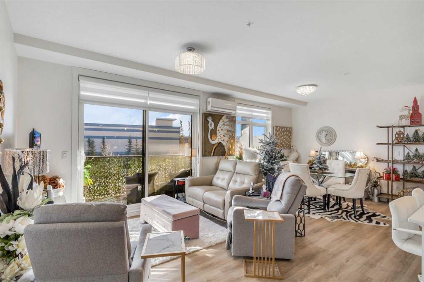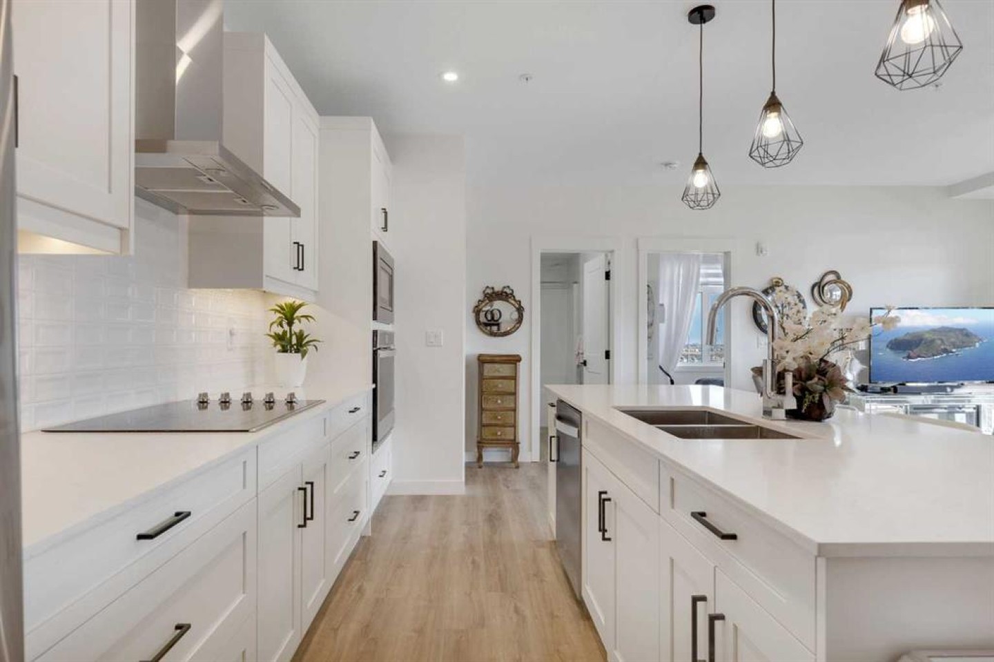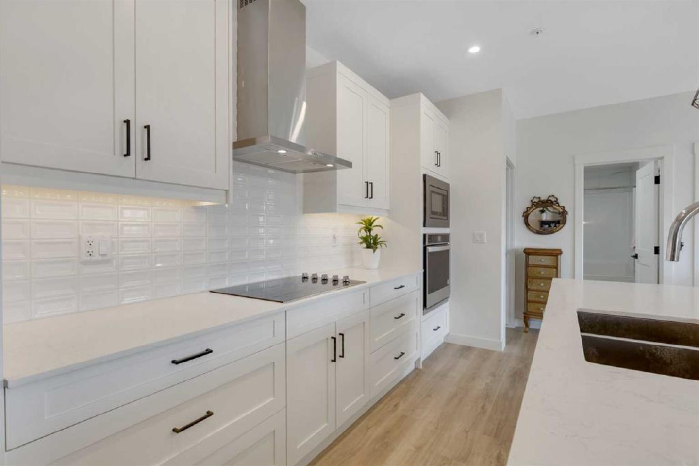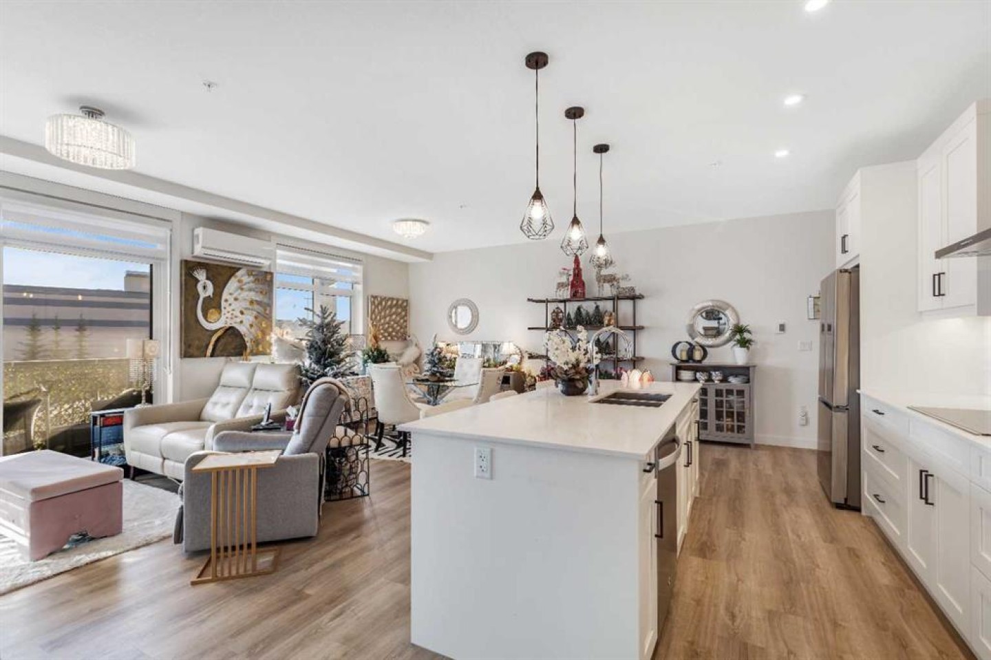 Welcome to this well maintained 2021 built 2 bedroom, 2 bathroom luxury ground level, corner unit condo in the amazing community of Sage Hill. From the front door, you are welcomed with a spacious private foyer with a closet, this condo features everything you will need with 1061 square feet of living space, luxury vinyl plank flooring throughout, a full eat in kitchen with gorgeous white contemporary quartz counter tops, a huge upgraded island, built-in microwave, built-in oven, a counter top stove, all stainless steel appliances with upgraded fridge, as well all the cupboards. It also features a large living area to comfortably fit a dining table, a full living room. The large Primary bedroom has a full walk-in closet, en-suite with double vanity, and a fully tiled shower with an 8mm glass sliding door. The spacious second bedroom offers direct access to the second full bathroom with large vanity, tile and a tub/shower combo. The laundry room offers extra storage space, full size front load stacked washer and dryer. Enjoy the morning sun on the large wrap around patio which has a natural gas line. This unit has full air conditioning to keep you cool during the hot summer months, and upgraded blinds on all the windows. Stay warm in the winter months with secure heated underground parking and a storage unit at your parking stall. This professionally managed building is well taken care. Just walking distance from your patio to the Township shopping complex in Sage Hill across the street for all your necessities.