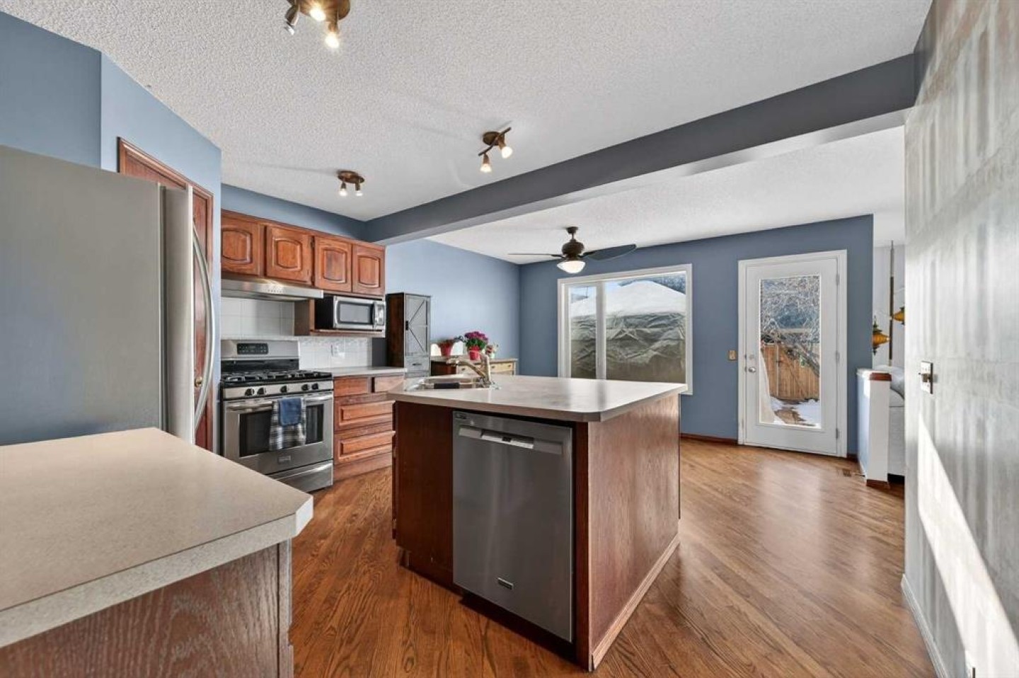 OPEN HOUSE SAT MARCH 7 1:00-4:00. Welcome to this wonderful family home tucked away on a quiet street with 2 Playgrounds just steps away. This home has 1,910 ft2 of developed living space including 4 bedrooms, all upstairs! As you enter in the front door you are greeted by an open front foyer that is flanked by an office/family room on one side and the laundry room and powder room on the other. Rich hardwood flooring flows throughout the main level from the front door to the kitchen, dining area and living room. Perfect layout for entertaining and enjoying family time. The kitchen has stainless steel gas stove, refrigerator and dishwasher and a large walk in pantry. The island has plenty of cupboards and counter space for preparing food and storing the appliances and extra dishes. The newly painted living room is flooded with natural light and fresh air from the large venting windows. The wood fireplace with mantle comes with a gas log lighter. The dining area can accommodate a large family sized table and is conveniently located next to the door to back deck and BBQ area. Upstairs you will be thrilled to find 4 bedrooms. The primary suite is huge with an extended room boasting a downtown Calgary view! This space is perfect for an exercise area or quiet space to enjoy a book. The bedroom will fit all your king sized furniture and has a walk in closet and 4 piece ensuite with a jetted bathtub, shower, water closet and sink vanity. The other three bedrooms are all a generous sizes with big closets and share a 4 piece bathroom. The unfinished basement is awaiting your development ideas, if you need extra finished space. This property has a large fenced, beautifully landscaped yard with gardens and a deck with a pergola that is great in the summer and has a cover for use in the winter also! The garden shed is perfect for storing your outdoor tools. Recent updates include; ALL POLY B HAS BEEN REPLACED WITH PEX PLUMBING - 2026, DISHWASHER - 2025, FENCE - 2024, DECK - 2023, GAZEBO - 2023, ALL WINDOWS - 2023, ASPHALT SHINGLES - 2016