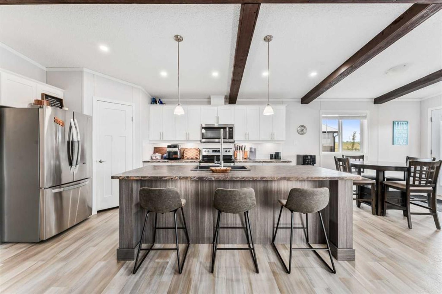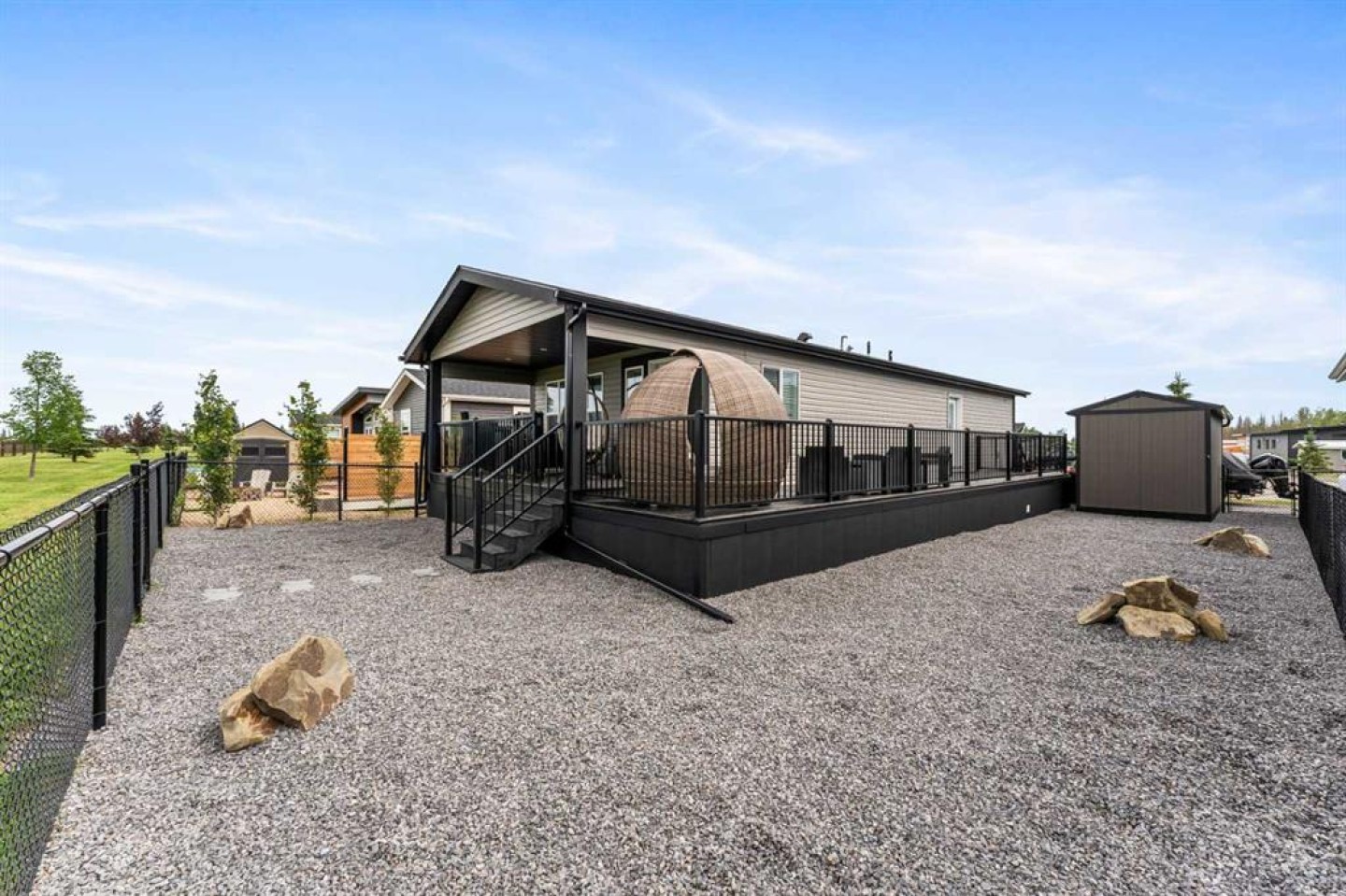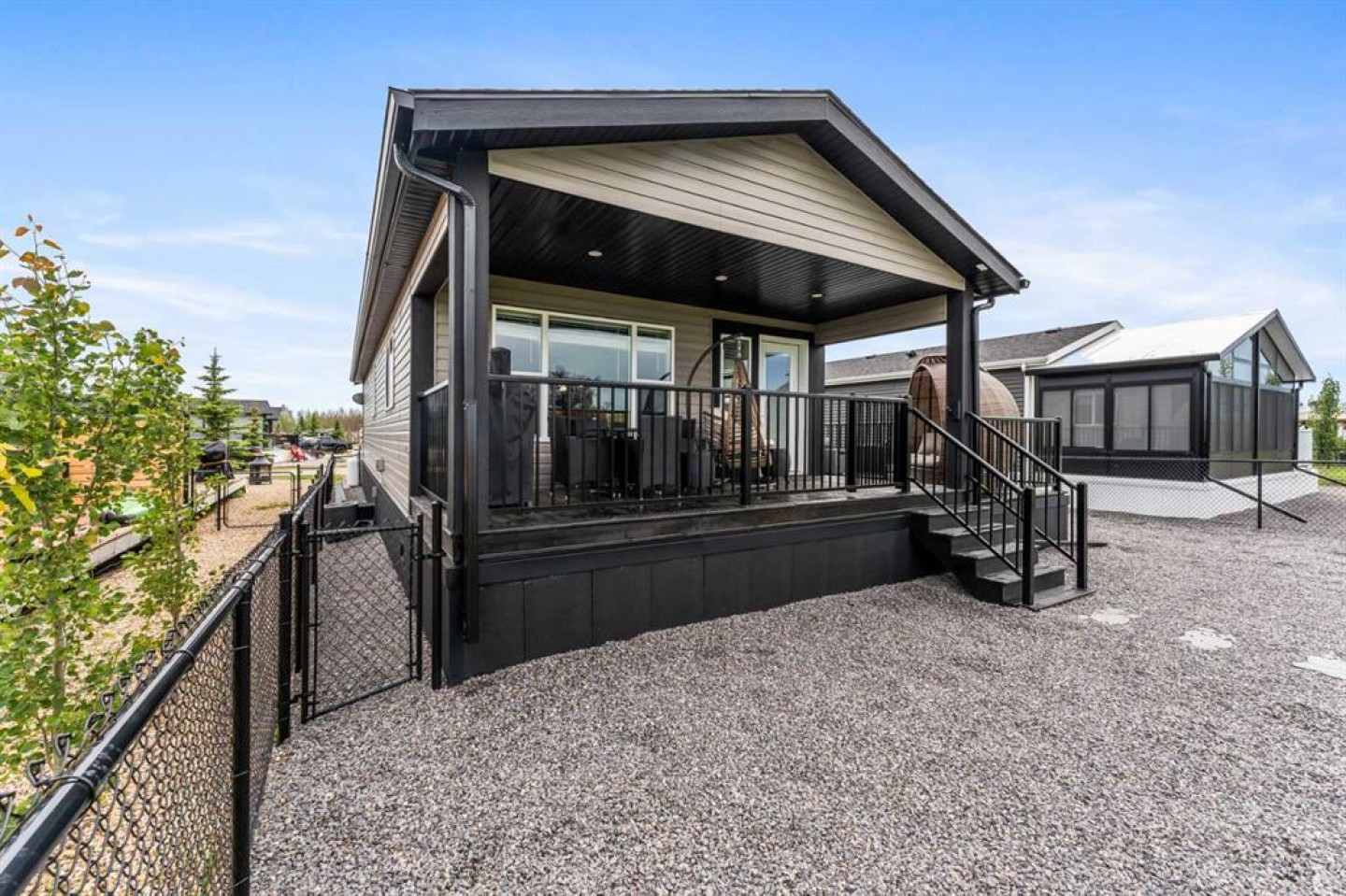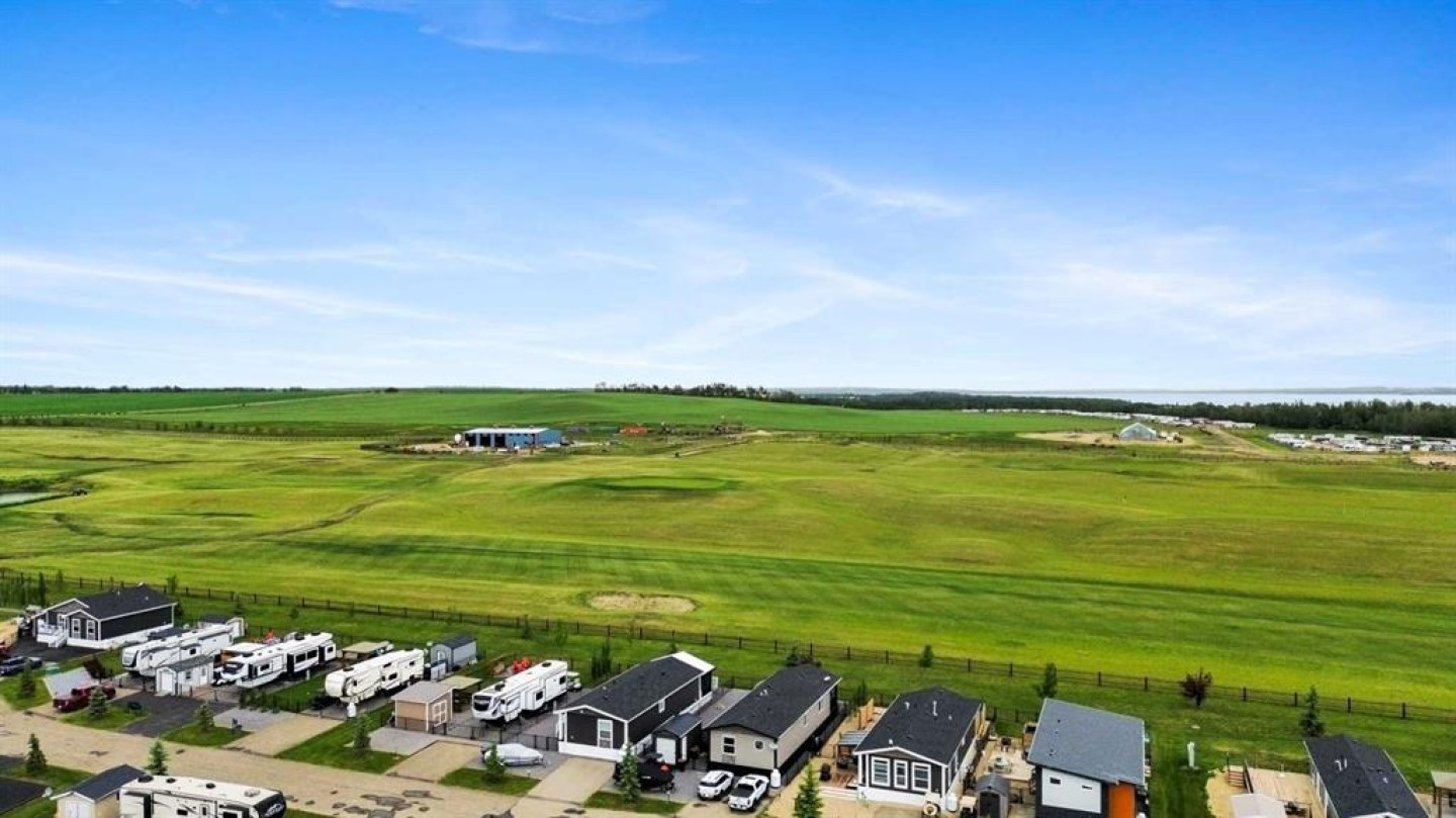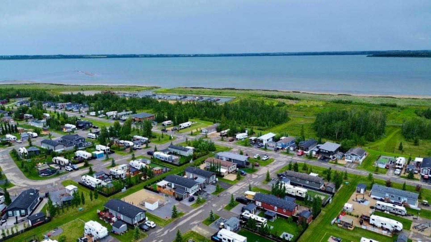 Welcome to Southview at Sandy Point, a sought-after gated lake community on the southwest shores of Gull Lake, where modern comfort meets the relaxed lifestyle of year-round lake living in Central Alberta. Built in 2021, this stylish 2-bedroom, 2-bathroom modular home offers 1,040 square feet of thoughtfully designed living space, making it an ideal option for a full-time residence, weekend getaway, or low-maintenance vacation property near the water. Step inside to a bright open-concept layout highlighted by vaulted beamed ceilings, large windows, and an abundance of natural light. The spacious kitchen is designed for both everyday living and entertaining, featuring a large island with breakfast bar seating, full pantry, stainless steel appliances, and plenty of cabinetry for storage. The inviting living room is centered around a cozy fireplace, creating the perfect space to unwind after a day on the lake or hosting friends and family. The primary bedroom retreat offers privacy and comfort with a generous walk-in closet and a full ensuite bathroom, while the second bedroom and additional 4-piece bathroom provide great flexibility for guests, family members, or a home office. A full-size laundry area adds everyday convenience to the home’s functional design. Outdoor living is just as impressive. Step onto the large wraparound deck, perfect for enjoying morning coffee, summer BBQs, and relaxing evenings around the firepit. With no rear neighbours and open views toward the future golf course fairways, the setting offers peace, privacy, and beautiful prairie sunsets. The fully fenced, zero-maintenance yard is tastefully landscaped and includes a storage shed, allowing you to enjoy the outdoor space without the burden of heavy upkeep. Located within the year-round Southview community at Sandy Point Resort, residents enjoy access to one of the most desirable Gull Lake recreational destinations in Central Alberta. Community amenities include a public sandy beach, marina, playgrounds, walking trails, picnic areas, RV and boat storage, and plenty of opportunities for boating, fishing, and outdoor recreation. This location combines the best of lake life and convenience, just minutes from Bentley, a short drive to Sylvan Lake and Red Deer, and under two hours from Calgary and Edmonton. Whether you’re looking for a peaceful lakeside escape, or a comfortable home in a vibrant resort-style community, this property delivers. Move-in ready, beautifully maintained, and designed for low-maintenance living—this is your opportunity to own a piece of Gull Lake paradise and enjoy lake life 365 days a year.