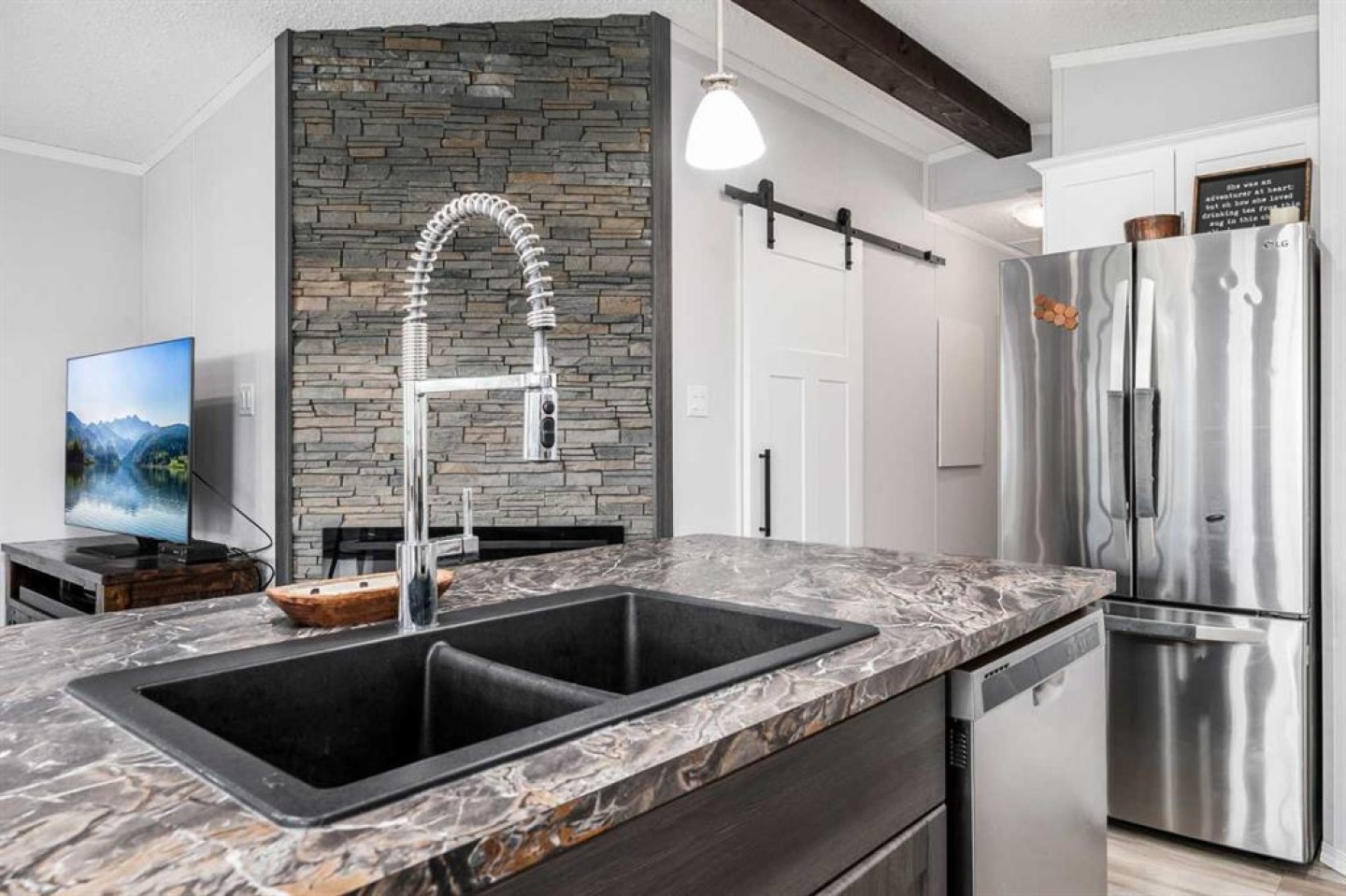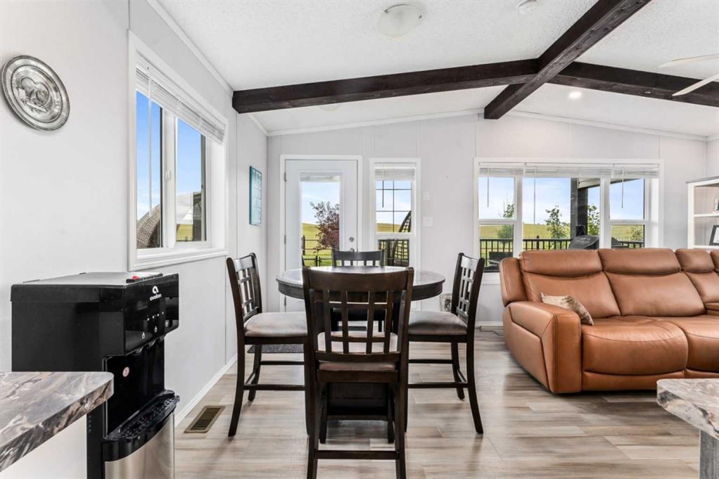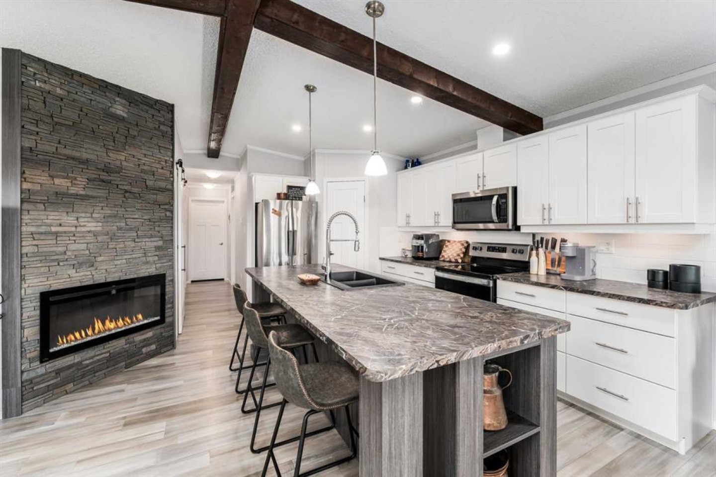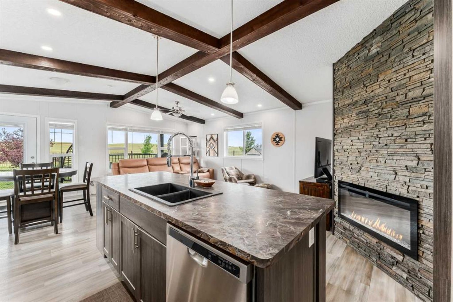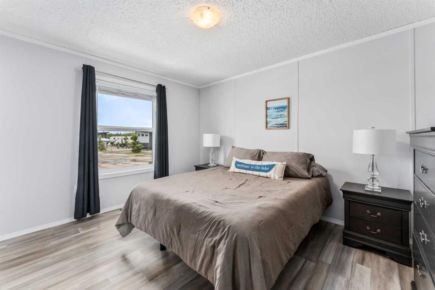 Welcome to Southview at Sandy Point, a sought-after gated lake community on the southwest shores of Gull Lake, where modern comfort meets the relaxed lifestyle of year-round lake living in Central Alberta. Built in 2021, this stylish 2-bedroom, 2-bathroom modular home offers 1,040 square feet of thoughtfully designed living space, making it an ideal option for a full-time residence, weekend getaway, or low-maintenance vacation property near the water. Step inside to a bright open-concept layout highlighted by vaulted beamed ceilings, large windows, and an abundance of natural light. The spacious kitchen is designed for both everyday living and entertaining, featuring a large island with breakfast bar seating, full pantry, stainless steel appliances, and plenty of cabinetry for storage. The inviting living room is centered around a cozy fireplace, creating the perfect space to unwind after a day on the lake or hosting friends and family. The primary bedroom retreat offers privacy and comfort with a generous walk-in closet and a full ensuite bathroom, while the second bedroom and additional 4-piece bathroom provide great flexibility for guests, family members, or a home office. A full-size laundry area adds everyday convenience to the home’s functional design. Outdoor living is just as impressive. Step onto the large wraparound deck, perfect for enjoying morning coffee, summer BBQs, and relaxing evenings around the firepit. With no rear neighbours and open views toward the future golf course fairways, the setting offers peace, privacy, and beautiful prairie sunsets. The fully fenced, zero-maintenance yard is tastefully landscaped and includes a storage shed, allowing you to enjoy the outdoor space without the burden of heavy upkeep. Located within the year-round Southview community at Sandy Point Resort, residents enjoy access to one of the most desirable Gull Lake recreational destinations in Central Alberta. Community amenities include a public sandy beach, marina, playgrounds, walking trails, picnic areas, RV and boat storage, and plenty of opportunities for boating, fishing, and outdoor recreation. This location combines the best of lake life and convenience, just minutes from Bentley, a short drive to Sylvan Lake and Red Deer, and under two hours from Calgary and Edmonton. Whether you’re looking for a peaceful lakeside escape, or a comfortable home in a vibrant resort-style community, this property delivers. Move-in ready, beautifully maintained, and designed for low-maintenance living—this is your opportunity to own a piece of Gull Lake paradise and enjoy lake life 365 days a year.