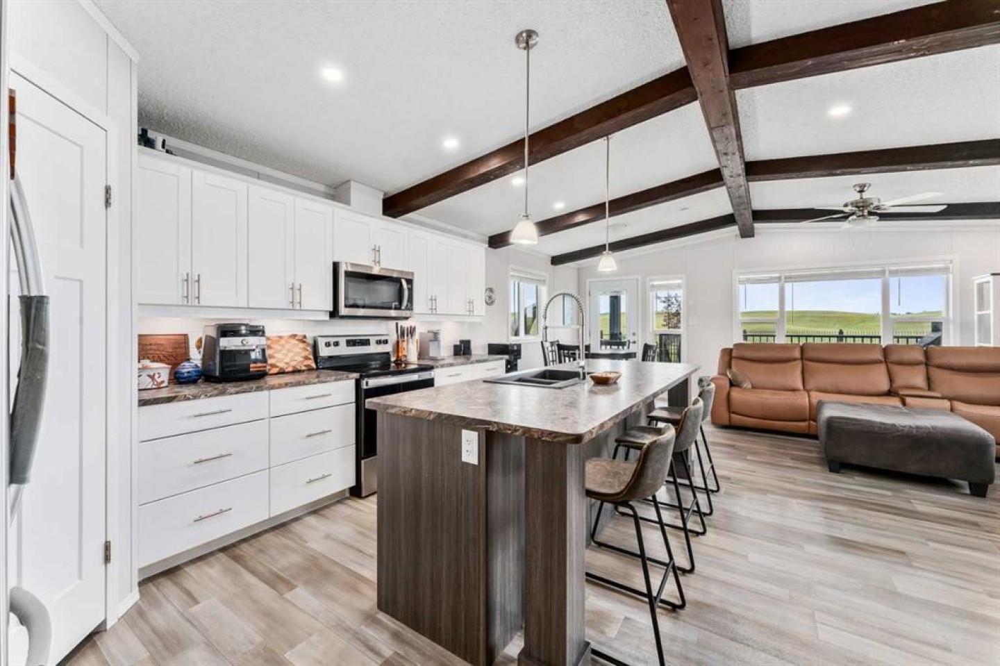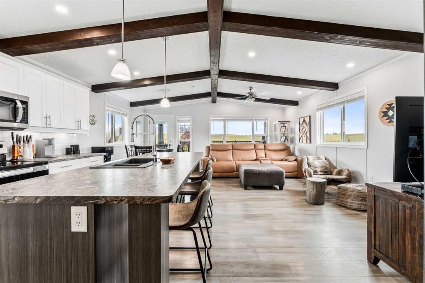 Beamed Ceilings, Breakfast Bar, Ceiling Fan(s), High Ceilings, Kitchen Island, Open Floorplan, Pantry, Walk-In Closet(s)
