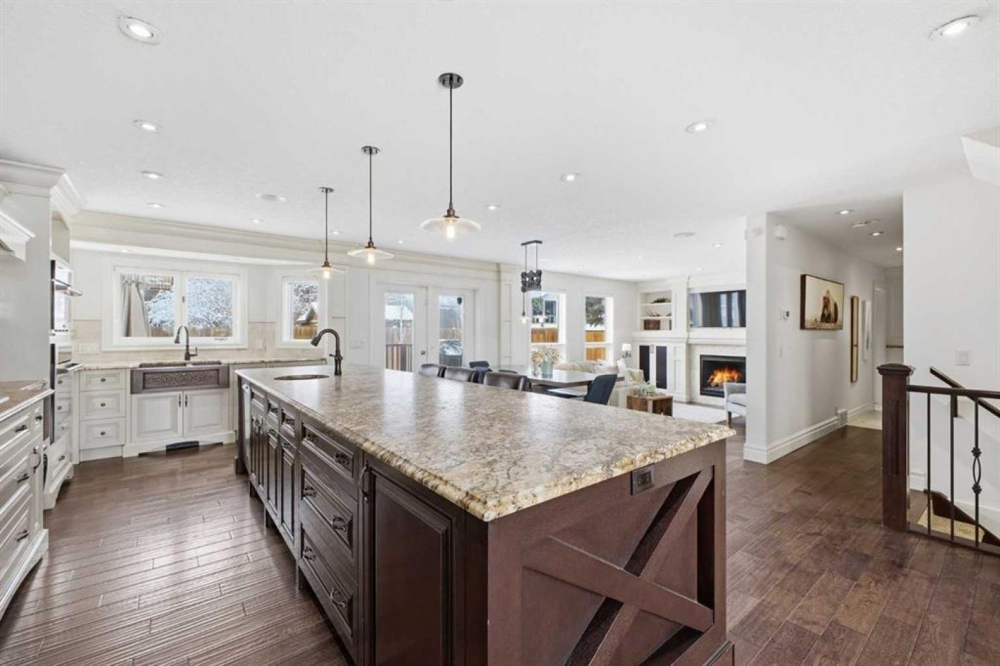 Luxuriously renovated from top to bottom, this stunning 3+2 bedroom home sits JUST STEPS FROM THE TRANQUIL PATHWAYS OF FISH CREEK PROVINCIAL PARK and offers nearly 3,700 sq ft of beautifully developed living space as well as an oversized triple attached garage. The main level features rich engineered hardwood and an abundance of natural light, beginning with a sunken living room highlighted by an oversized chandelier and dual ceiling fans. The showpiece kitchen is finished with custom millwork and cabinetry, granite countertops, a 12’ island with seating where friends and family can gather, two copper sinks, and top tier appliances including a Bertazzoni Italian gas cooktop. A spacious dining area easily accommodates family dinners or large gatherings. The sunken family room is anchored by a striking feature fireplace and custom built ins, while a private office with a coffered ceiling and herringbone tile flooring creates an ideal work from home retreat. A stylish 2 piece powder room and a generous laundry/mudroom—complete with herringbone tile, coat hooks, and individual storage cubbies—round out the main level. Upstairs, a quiet loft with an overhead skylight leads to three generously sized bedrooms and a beautifully updated 5 piece main bath. The primary suite is a true sanctuary, featuring his and hers custom closets with individually designed millwork, built in entertainment and art frames, and an elegant chandelier. The secluded 5 piece ensuite includes a large dual sink vanity, a new bathtub, and a separate shower finished with natural Italian stone and a granite bench. The additional bedrooms each offer built in closets. The fully developed basement is designed for both entertainment and wellness. A spacious media/family room features a hard wired solid wood entertainment unit, plus an entertainment nook with a wet bar, commercial grade fridge, dishwasher, storage, and wine rack. A dedicated home gym with commercial grade rubber flooring, floor to ceiling mirrors, and built in shelving provides a private space to work out. Two additional bedrooms, a 3 piece bath, and a large storage area complete the lower level. Additional highlights include central air conditioning, built in speakers throughout, a new Lennox high efficiency furnace, new AO Smith hot water tank, Kinetico water softener, Vivint/Telus alarm system, and complete removal of Poly B plumbing. Outside, enjoy the exposed aggregate front porch and a beautifully finished backyard with a deck coated with Duradeck, raised garden boxes within a gated garden area, a garden shed, and a Rain Bird irrigation system. Parking is effortless with the oversized triple attached garage, featuring epoxy flooring, a finished ceiling, EV charger, built in heater, and custom floor to ceiling cabinetry with quartz countertops. This premier location offers nature at your doorstep along with convenient access to schools, shopping, public transit, and major routes including Canyon Meadows Drive and Bow Bottom Trail.